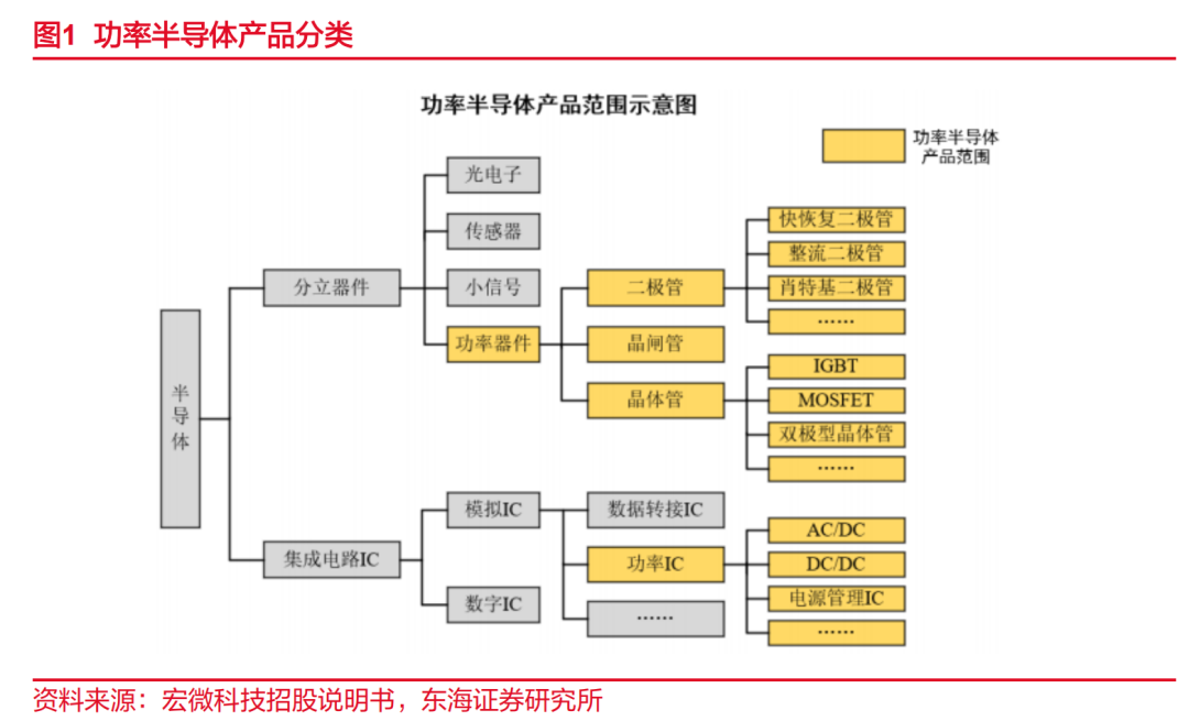 功率半导体根据集成度可以分为分立器件中的功率器件和集成电路IC中的功率IC两个大类。