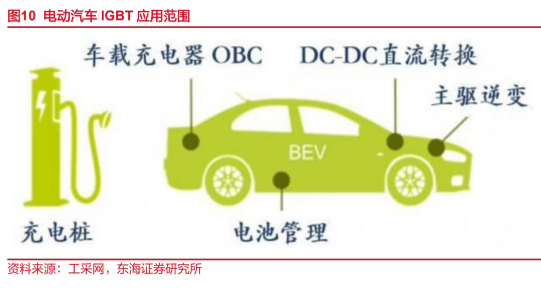 IGBT主要应用于电动汽车电机驱动、DC/DC升压变换器、双向DC/AC逆变器,以及充电端的DC/DC降压变换器。对于电动控制系统,作用于大功率直流/交流(DC/AC)逆变后汽车电机的驱动;对于车载空调控制系统,作用于小功率直流/交流(DC/AC)的逆变;对于充电桩,在智能充电桩中被作为开关元件使用。