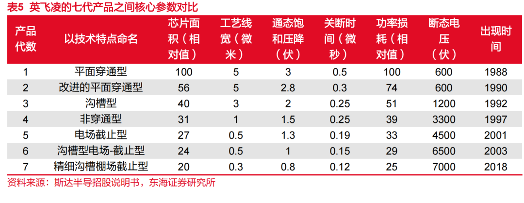 如下所表示,全球IGBT龙头企业英飞凌有史以来诞生了七代不同的产品,每一代产品在结构上有较大的差异,在关键性能指标上也都有较大的提升,相对来说越是先进的产品,性能效果越高,能够将产品研发到第几代技术,某种程度上也说明了企业在绝对技术上的研发实力。如果考虑到成本等因素,IGBT目前性价比较高的产品属于第四代产品。