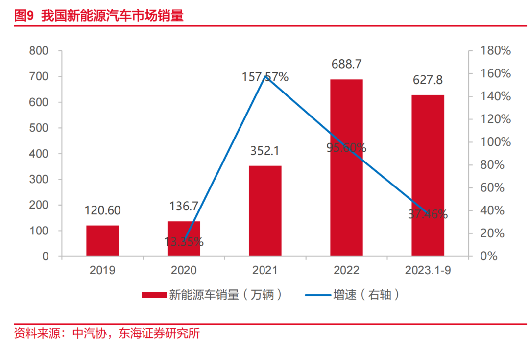 根据中国汽车协会数据,2021年中国新能源车销量达到352.1万辆,同比增速为157.57%,2022年持续大幅增长达688.7万辆,同比增长95.60%,2019-2022年CAGR达到78.74%,增速处于高位,2023年市场余热未消,继续保持增长势头,可以预见,未来几年新能源车市场将一直处于繁荣上升期,高景气度持续。