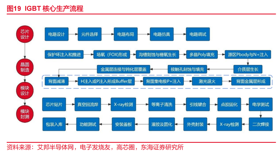 (1)IGBT的核心生产过程也包括芯片设计、晶圆制造、封测与模块设计三个主要部分,各有其技术难点。