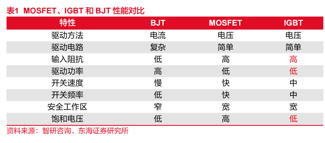 金氧半场效晶体管(MOSFET)输入阻抗高、驱动功率小、开关速度快;而双极型三极管(BJT)饱和压降低,BJT更强调工作功率,MOSFET更强调工作频率,因此IGBT兼有以上两种器件的优点,性能优势显著。