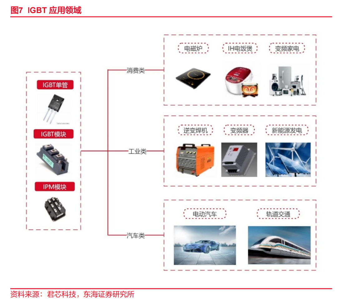 IGBT应用范围按照领域的不同主要可以分为三大类:消费类,工业类,汽车类。IGBT单管主要应用于小功率家用电器、分布式光伏逆变器;IGBT模块主要应用于大功率工业变频器、电焊机、新能源汽车(电机控制器、车载空调、充电桩)等领域;而IPM模块应用于变频空调、变频冰箱等白色家电产品。
