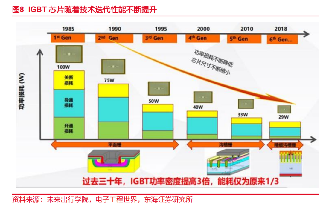 IGBT芯片随着每一代产品的升级,各项性能指标均有提升,考虑成本后,当前性价比较高、应用广泛的是第四代产品。