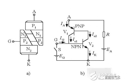 可控硅是P1N1P2N2四层三端结构元件,共有三个PN结,分析原理时,可以把它看作由一个PNP管和一个NPN管所组成,其等效图解如图所示