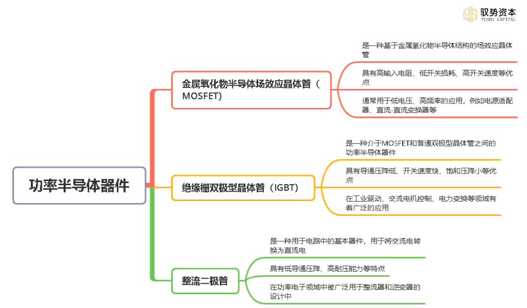 MOSFET是一种基于金属氧化物半导体结构的场效应晶体管。它具有高输入电阻、低开关损耗、高开关速度等优点,因此在高频率、低功率应用中得到了广泛应用。在功率电子领域,MOSFET通常用于低电压、高频率的应用,例如电源适配器、直流-直流变换器等。