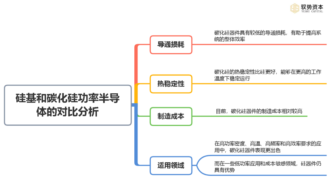 - 适用领域:在高功率密度、高温、高频率和高效率要求的应用中,碳化硅器件表现更出色;而在一些低功率应用和成本敏感领域,硅器件仍具有优势。